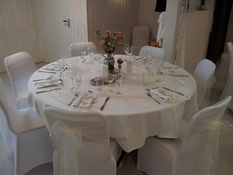 Fossheim ble pynta til bryllup både ute og inne. lLi Anne (kollega) pynta ute og våre søstre pynta inne. Ble veldig fornøyd, med runde bord, hvite trekk på stolene og sløyfe ble samfunnshuset helt forandra.